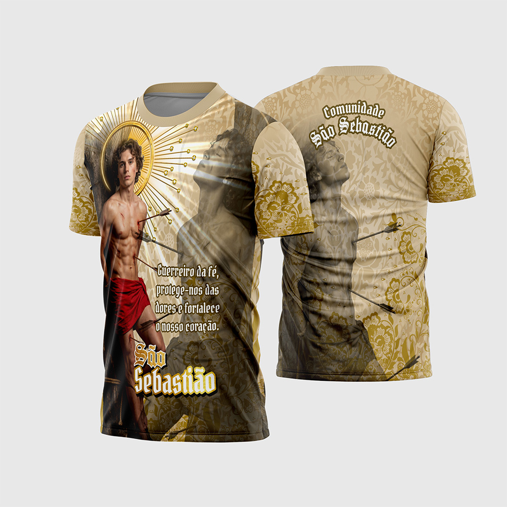 Primeiramente, prepare o seu catálogo para faturar alto no fervoroso e gigantesco nicho de fardamentos religiosos oferecendo a espetacular e luxuosa Arte Camisa Devocional São Sebastião 2026 Exclusiva. Atualmente, as comunidades católicas e grupos de oração buscam incessantemente designs que fujam do comum, exigindo estampas com qualidade fotorrealista e acabamento de alta costura. Sendo assim, este modelo digital foi meticulosamente elaborado para entregar a estética premium absoluta que os devotos mais exigentes desejam vestir nas festividades do padroeiro. Além disso, a combinação magistral da paleta de cores em tons de Ouro, Bege e Sépia com o contraste vibrante do tecido vermelho do Santo, garante uma peça de extremo requinte, impacto visual e altíssima conversão de vendas.