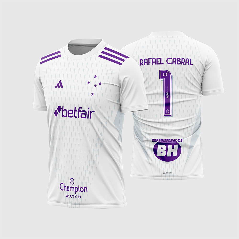 Por outro lado, o que realmente transforma esta arte em uma verdadeira máquina de faturamento é o seu impressionante trabalho de fidelidade visual. A parte frontal traz a icônica constelação do Cruzeiro do Sul e a marca do fornecedor esportivo perfeitamente alinhadas, ganhando um contraste maravilhoso e moderno na cor roxa. O grande destaque é o impressionante fundo texturizado geométrico (pequenos losangos/setas) que percorre toda a peça em um tom sutil de cinza claro/gelo, idêntico aos modelos azul e amarelo, mas com um ar muito mais clean. Consequentemente, a camisa final impressa entregará uma estética majestosa, limpa e digna de um verdadeiro paredão celeste.