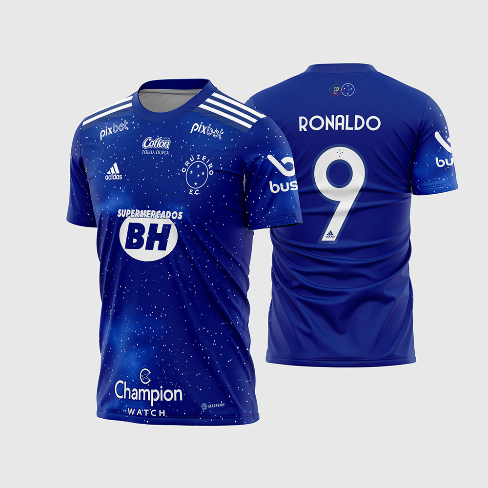 Da mesma forma, as costas e os detalhes complementares mantêm o absoluto requinte visual. O layout traseiro continua a deslumbrante textura galáctica e destaca com perfeição a clássica numeração e a assinatura do lendário “RONALDO 9”. Para completar, as tradicionais listras brancas nos ombros fecham a composição com total maestria esportiva, garantindo um caimento impecável. Portanto, o layout final é o sonho de consumo perfeito para vestir qualquer torcedor apaixonado, time amador ou para ser o destaque do seu portfólio de sublimação.