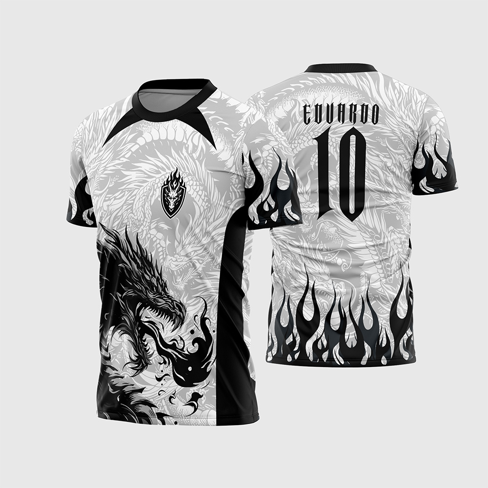 Por outro lado, o que realmente transforma esta arte em uma verdadeira máquina de faturamento é o seu impressionante trabalho de ilustração gráfica. Na parte frontal, temos a aplicação visceral de um dragão sombrio cuspindo chamas negras, perfeitamente harmonizado com um escudo frontal no peito e uma riquíssima textura de dragões orientais e escamas que preenche todo o fundo da peça. Consequentemente, a camisa final impressa entregará uma estética premium, super moderna e digna de campeões temidos pelos adversários.
