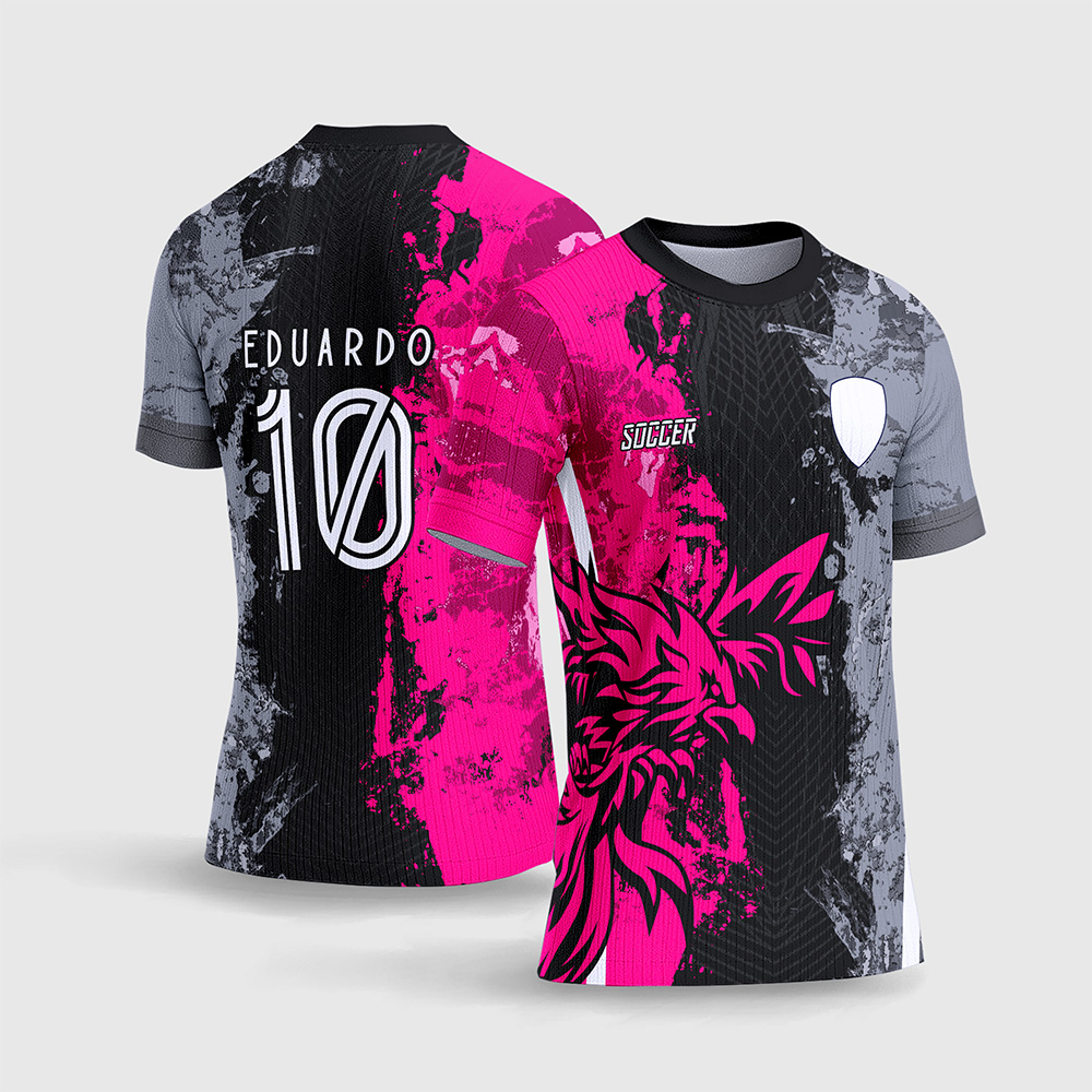 Por outro lado, o que realmente transforma esta arte numa verdadeira máquina de faturamento é a sua composição ousada e artística. A parte frontal é dividida de forma genial por uma textura “grunge” de respingos e manchas de tinta, separando a área escura da área rosa explosiva. O grande e espetacular diferencial deste fardamento é a ilustração estilizada de uma Fênix em Rosa Pink, aplicada sobre o lado preto, criando um contraste absurdo que salta aos olhos. Consequentemente, a camisa final impressa entregará uma estética majestosa, super moderna e incrivelmente alinhada à moda de alta performance e cultura de rua.