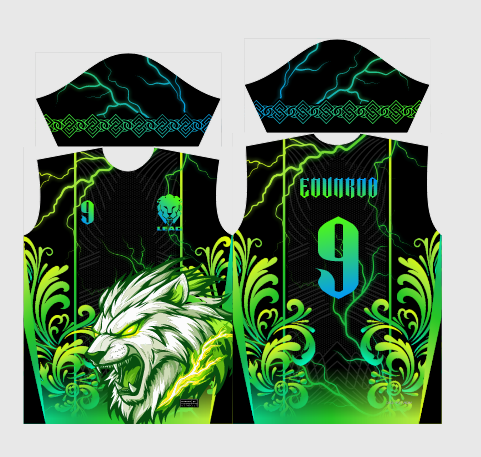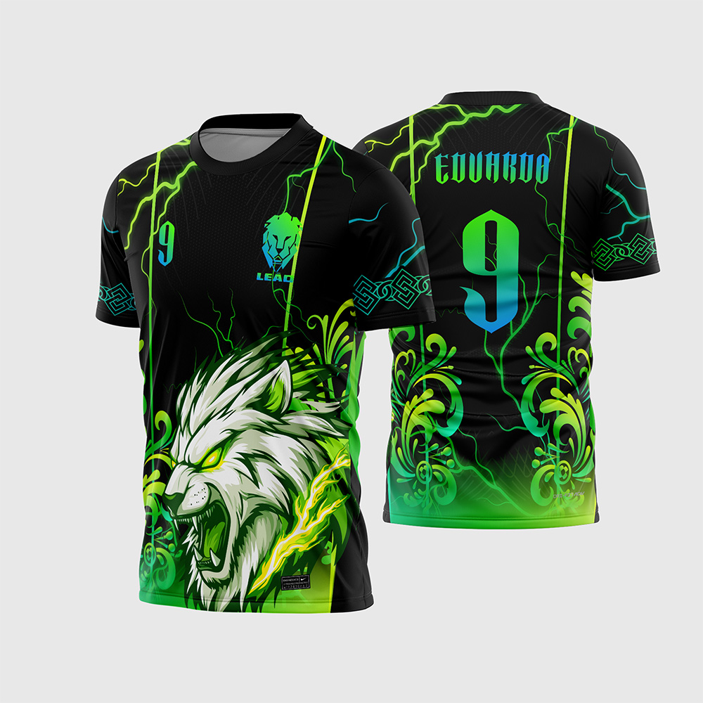 O grande destaque deste modelo é a sua composição dinâmica e cheia de atitude. Na frente, uma imponente ilustração de um Leão Branco rugindo, com olhos brilhantes e cercado por raios e arabescos tribais em verde neon. O peito traz um escudo minimalista com o mascote, perfeito para colocar o nome do time ou da turma. Nas costas, o número gigante em degradê (Verde para Azul) ganha destaque absoluto sobre os raios e padrões gráficos, garantindo que o fardamento seja o mais chamativo da quadra.