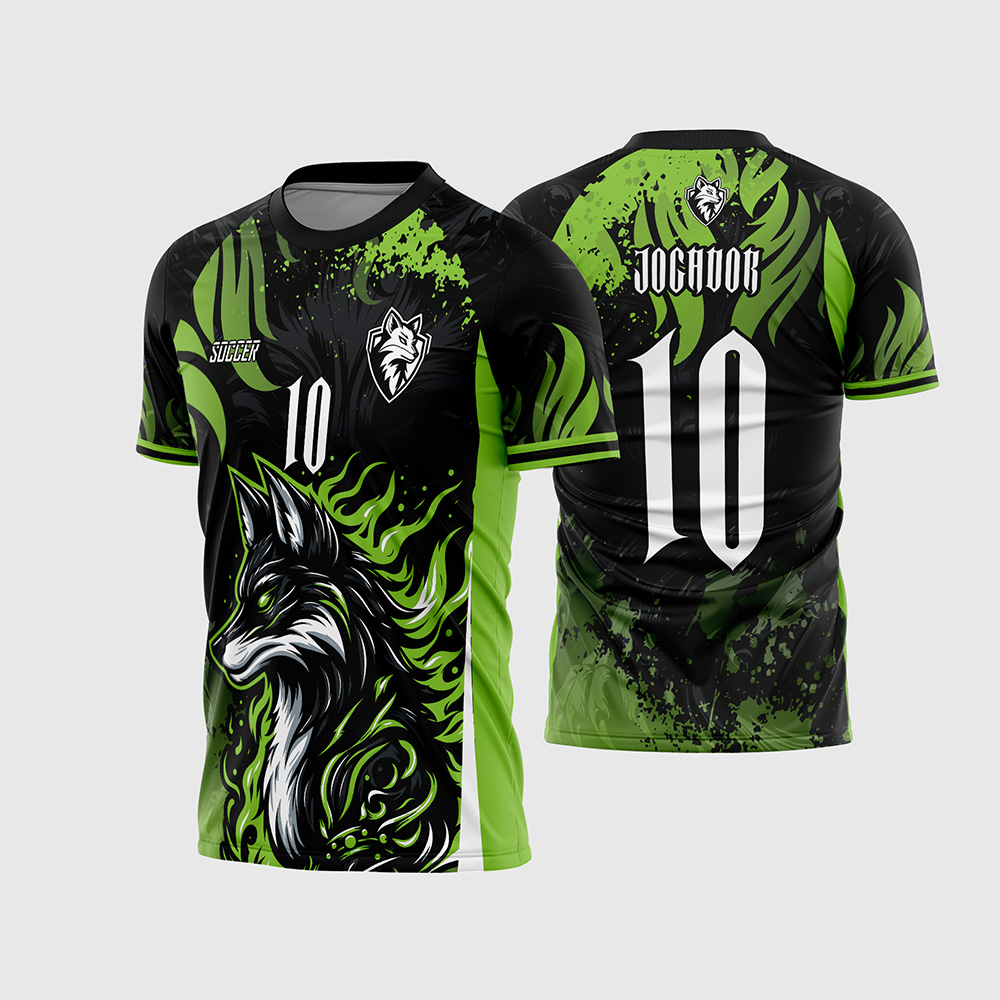Por outro lado, o que realmente transforma esta arte em uma verdadeira máquina de downloads é o seu impressionante trabalho de ilustração gráfica. Na parte frontal, temos a aplicação visceral de uma imponente raposa negra (que também serve perfeitamente para times que utilizam o lobo como mascote), envolta em um padrão espetacular de chamas verdes e elementos tribais, além de um escudo frontal exclusivo no peito. Consequentemente, a camisa final impressa entregará uma estética premium, super dinâmica e digna de campeões.