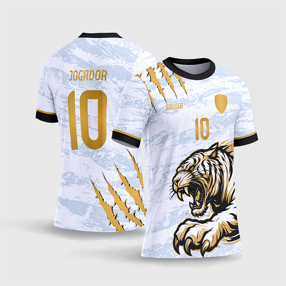 Por outro lado, o que realmente transforma esta arte numa verdadeira máquina de faturamento é a sua composição dinâmica e intimidadora. A parte frontal inferior traz a ilustração hiper-agressiva de um Tigre Branco rugindo, com a sua pata e garras à mostra, pronto para o ataque. O grande e espetacular diferencial deste fardamento é a textura sutil de fundo (lembrando um mármore ou gelo rachado em tons de azul clarinho), que quebra a monotonia do branco liso. Consequentemente, a camisa final impressa entregará uma estética majestosa, super refinada e incrivelmente alinhada à moda de alta performance.