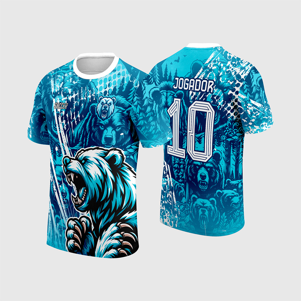 Da mesma forma, as costas da peça mantêm o absoluto requinte visual e a ferocidade do tema. O layout já acompanha uma diagramação esportiva moderna, ilustrada perfeitamente no mockup com o nome “JOGADOR” e uma imponente camisa 10 estilizada e vazada. Para completar, as costas e mangas acompanham a textura profunda de ursos na floresta e trazem filetes de acabamento em branco que fecham o design com total maestria. Portanto, o layout final é o sonho de consumo perfeito para qualquer interclasse que queira impor respeito absoluto.