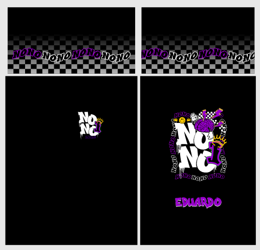 A composição visual desta camisa é rica em referências urbanas. Na frente, o logotipo esquerdo traz as letras “NO NO” com efeito dripping (derretendo) e uma pequena coroa estilizada. Nas costas, a arte domina com a tipografia grafite derretida sobreposta por um grande número “9” e uma colagem criativa: o cérebro mascote segurando um raio, smiley face, coroa e padrões gráficos. O grande charme, no entanto, fica por conta das mangas estampadas em xadrez (quadriculado) com a palavra “NONO” em roxo, um detalhe clássico da cultura skatewear que agrega muito valor à peça.