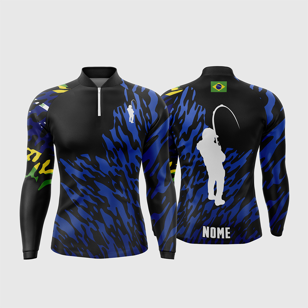 Da mesma forma, as costas e os detalhes complementares mantêm o absoluto requinte visual e a pegada esportiva do tema. O layout traz um espetacular pescador em tamanho gigante na silhueta branca central, oferecendo um espaço estrategicamente posicionado na barra inferior para o “NOME” do cliente. Para completar, as mangas longas acompanham um belíssimo recorte com a Bandeira do Brasil, aliadas à gola padre com zíper frontal que fecha o design com total maestria. Portanto, o layout final é o sonho de consumo perfeito para vestir qualquer equipe com estilo e muito patriotismo.