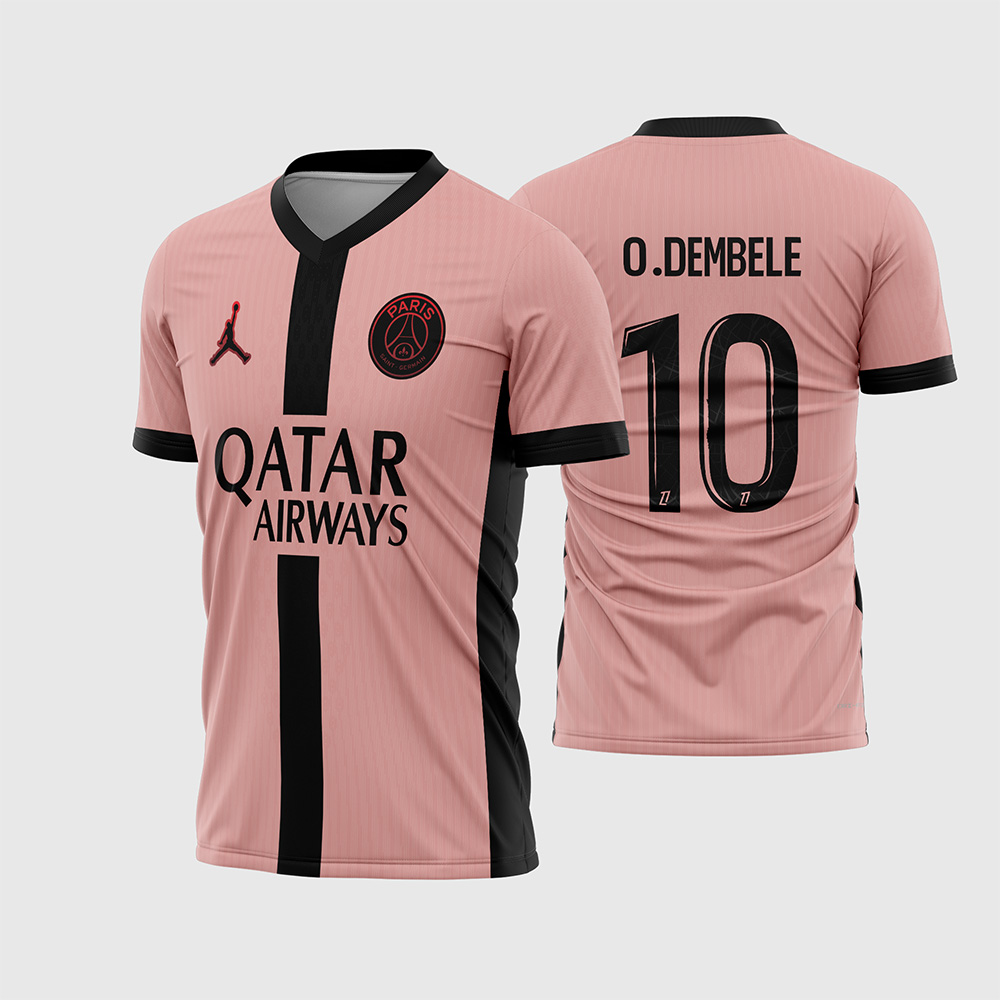 Traga a ousadia do estilo europeu para a sua estamparia com a Arte Vetor Camisa PSG Terceira 2024 – 2025. Este terceiro uniforme (Third Kit) do Paris Saint Germain é uma colaboração premium com a linha Jordan, projetado para chamar atenção dentro e fora dos gramados. A peça aposta em uma base deslumbrante na cor Rosa, uma tonalidade que virou febre entre os torcedores, contrastada pela icônica faixa vertical em Preto.