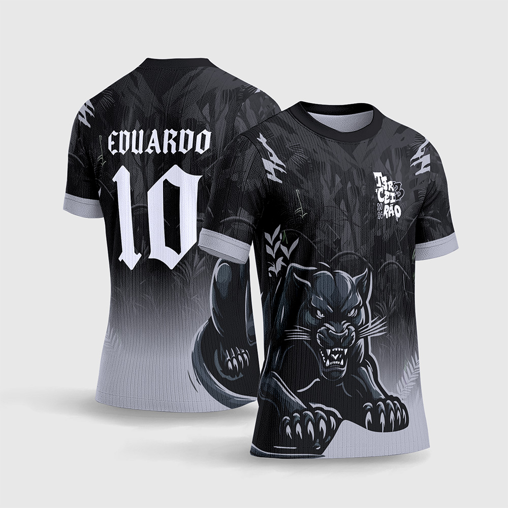Por outro lado, o que realmente transforma esta arte em uma verdadeira máquina de faturamento é o seu impressionante trabalho de ilustração integrada. Na parte frontal, temos a aplicação de uma pantera negra super agressiva, emergindo perfeitamente da transição do degradê cinza, com um olhar intimidador e garras à mostra, dialogando com a logo moderna do “Terceirão” no peito. Consequentemente, a camisa final impressa entregará uma estética super imponente, selvagem e ao mesmo tempo incrivelmente sofisticada, ideal para turmas que preferem tons mais discretos e versáteis.