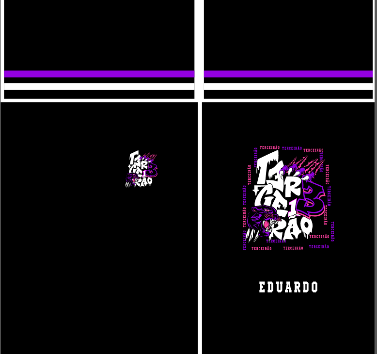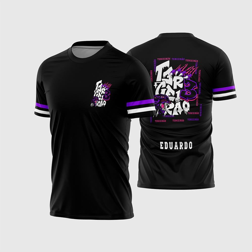 Por outro lado, o que realmente transforma esta arte em uma verdadeira máquina de faturamento é o seu impressionante trabalho de ilustração e o mix de cores nas costas. O layout traz uma espetacular cabeça de pantera negra rugindo, interagindo diretamente com a tipografia estilizada e distorcida da palavra “TERCEIRÃO” e o grande número “3” em destaque. Tudo isso emoldurado por uma borda quadrada formada por repetições da palavra “Terceirão” em tons de rosa e roxo. Consequentemente, a camisa final impressa entregará uma estética super moderna, que transmite a força, a união e a vibração da turma.