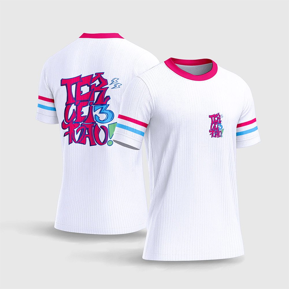 Por outro lado, o que realmente transforma esta arte em uma verdadeira máquina de faturamento é o seu impressionante trabalho tipográfico nas costas. O layout aposta tudo em uma espetacular composição de letras no estilo grafite/bubble, formando a palavra “TERCEIRÃO 3!”, acompanhada de pequenos raios estilizados. As cores vibrantes saltam aos olhos graças ao contraste perfeito com o fundo branco. Consequentemente, a camisa final impressa entregará uma estética super jovem, irreverente e incrivelmente alinhada à moda retrô dos anos 90 e 2000 que voltou com tudo.