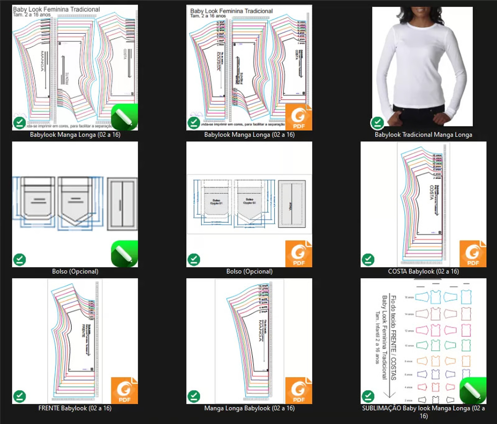A qualidade do arquivo digital garante medidas exatas. Em outras palavras, você obtém um molde testado, com grade de tamanhos variada, pronto para imprimir em impressora comum (A4) ou plotter. Além disso, este molde é essencial para quem trabalha com sublimação total, servindo como gabarito para aplicar as artes antes do corte.