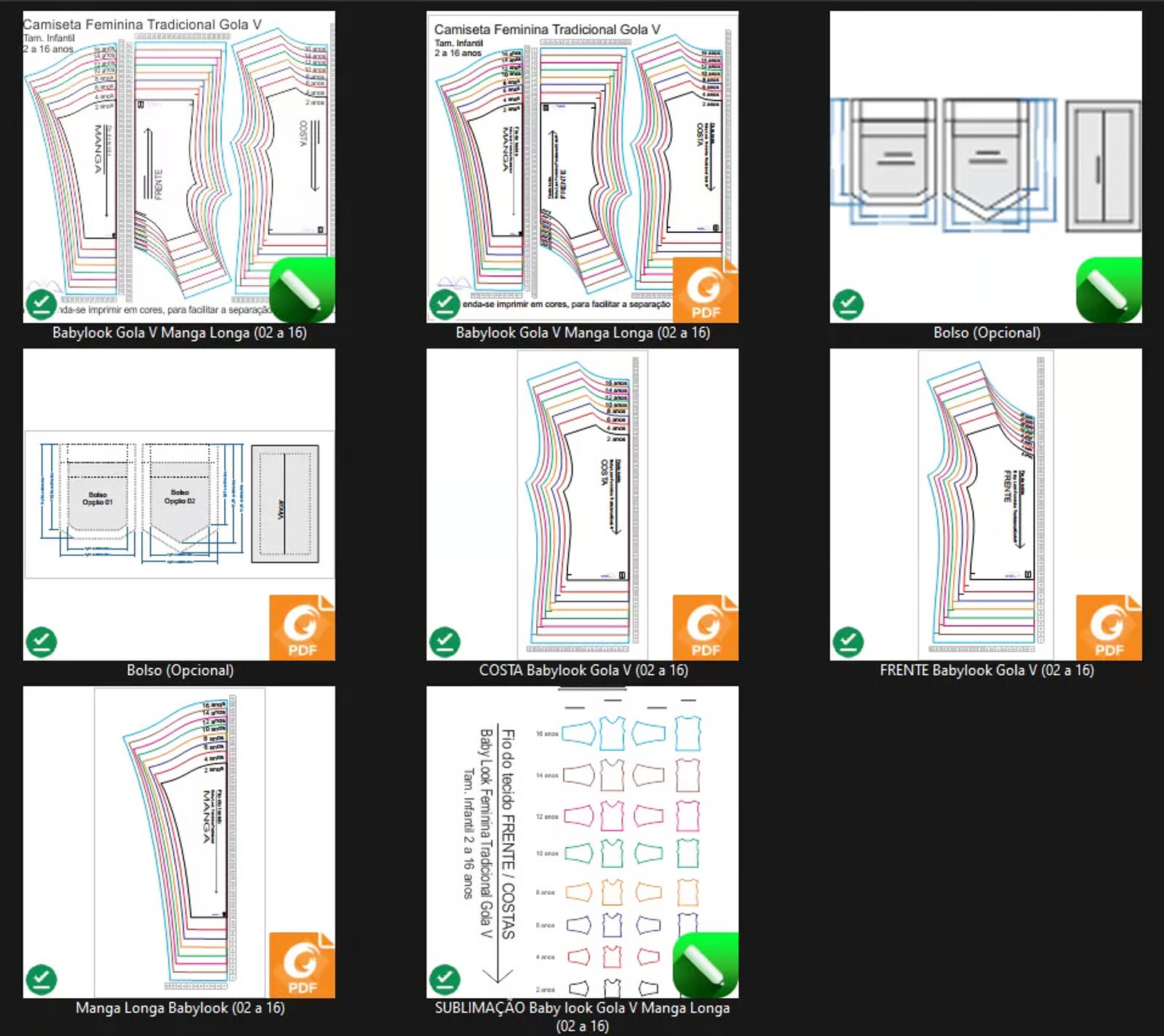A qualidade do arquivo digital garante medidas exatas. Em outras palavras, você obtém um molde testado, com grade de tamanhos variada, pronto para imprimir em impressora comum (A4) ou plotter. Além disso, este molde é essencial para quem trabalha com sublimação total, servindo como gabarito para aplicar as artes antes do corte.
