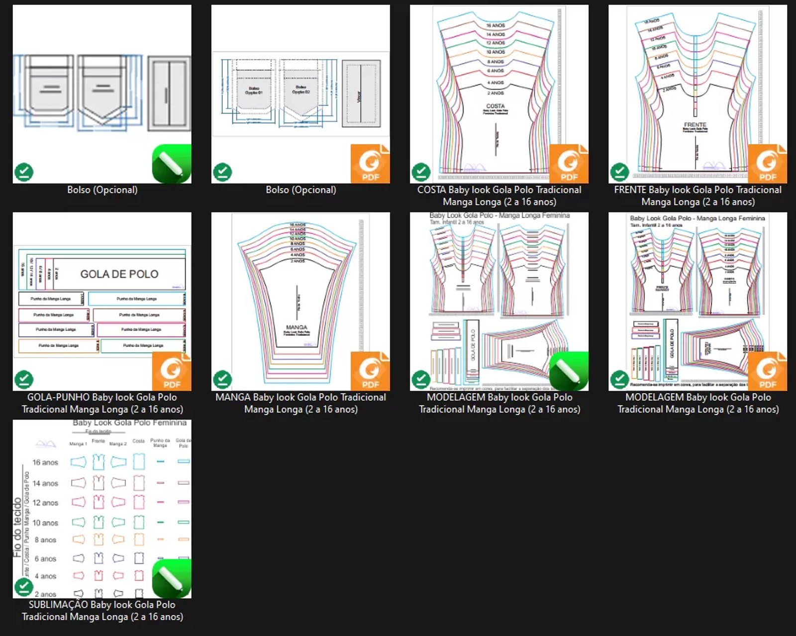 A qualidade do arquivo digital garante medidas exatas. Em outras palavras, você obtém um molde testado, com grade de tamanhos variada, pronto para imprimir em impressora comum (A4) ou plotter. Além disso, este molde é essencial para quem trabalha com sublimação total, servindo como gabarito para aplicar as artes antes do corte.