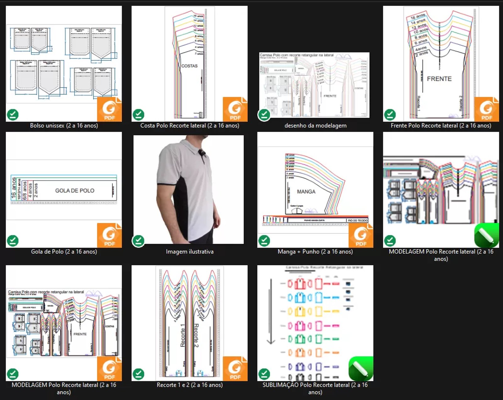 A qualidade do arquivo digital garante medidas exatas. Em outras palavras, você obtém um molde testado, com grade de tamanhos variada, pronto para imprimir em impressora comum (A4) ou plotter. Além disso, este molde é essencial para quem trabalha com sublimação total, servindo como gabarito para aplicar as artes antes do corte.